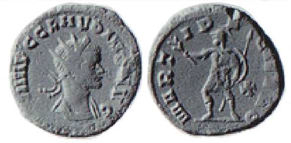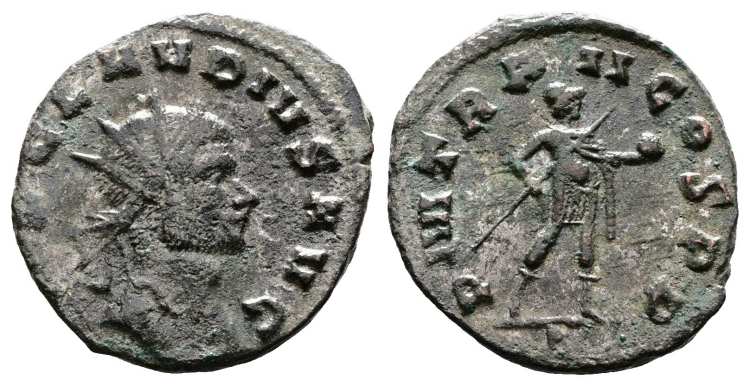 CNRS 103Claudius, AE antoninianus. Rome mint. IMP CM AVR CLAVDIVS PF AVG, radiate, draped, cuirassed bust right / VIRTVS AVG, Mars standing left, branch and vertical spear (point downwards), shield resting against his legs. RIC -; CNRS 103 (ric.mom.fr); Gysen collection 136 and 177; Evreux hoard, Chezelles hoard.TextImage