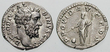 | RIC 1 | Clodius Albinus, as Caesar, Denarius. AD 193. D CLODIVS ALBINVS CAES, bare head right / PROVID AVG COS, Providentia standing left, holding sceptre and wand over globe at foot. RIC 1; RSC 58. | Text | Image |