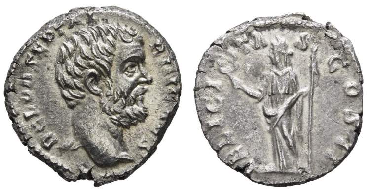 | RIC 17 | Clodius Albinus AR Denarius. 196-197 AD. Lyons mint. IMP CAES D CLO SEP ALB AVG, laureate head right / FIDES AVG COS II, Fides standing left, holding corn-ears and basket of fruit. RIC 17; BMC 282; Cohen 20; RSC 20a; Sear 6164. | Text | Image |