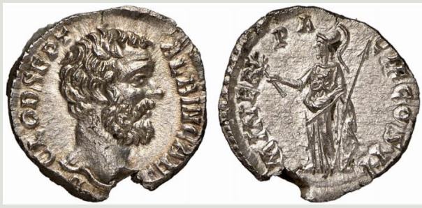| RIC 32 | Clodius Albinus, AD 193-197. AR denarius, struck AD 195-197, Lyons. 16mm., 3.26g. IMP CAES D CLO SEP ALB AVG, laureate head right. / PAX AVG COS II, Pax standing left, holding branch and cornucopiae. RIC 32a; RSC 53; BMCRE 287-288. | Text | Image |