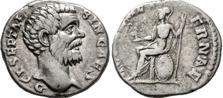 | RIC 11b | Clodius Albinus, as Caesar, Denarius. D CLOD SEPT ALBIN CAES, bare head right / ROMAE AETERNAE, Roma seated left on shield, holding Palladium and sceptre. RIC IVi, 11a; RSC 61; BMCRE 43. | Text | Image |