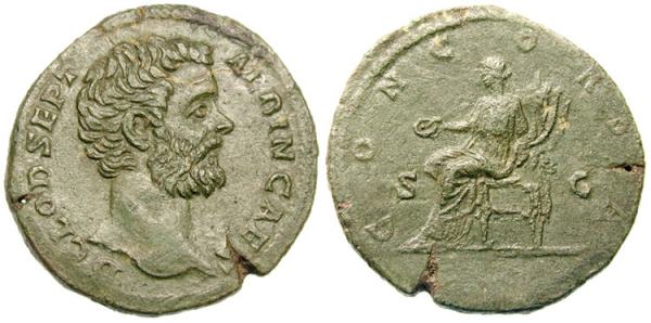 | RIC 62 Sear 6148 | Clodius Albinus, as Caesar, AE Sestertius. Rome mint, 195 AD. D CLOD SEPT ALBIN CAES, bare head right / CONCORDIA S C, Concordia seated left, holding patera and cornucopiae. RIC 62; Cohen 7. | Text | Image |