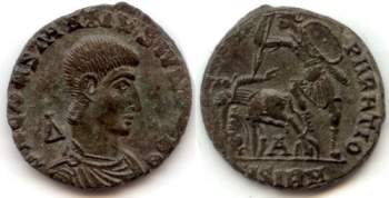 | Aquileia RIC VIII 198, S | Constantius Gallus AE22. D N CONSTANTIVS IVN NOB C, draped and cuirassed bust right, A behind / FEL TEMP RE-PARATIO, soldier spearing fallen horseman who is bare-headed, reaching backwards, LXXII to left, wreath in centre. Mintmark AQS. | Text | Image |