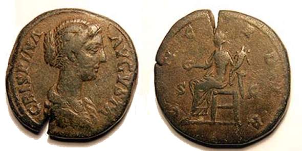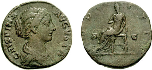 | RIC 675, Dupondius | Crispina AE Dupondius. CRISPINA AVGVSTA, draped bust right / CONCORDIA, SC in ex, Concordia seated left holding patera and cornucopiae. | Text | Image |