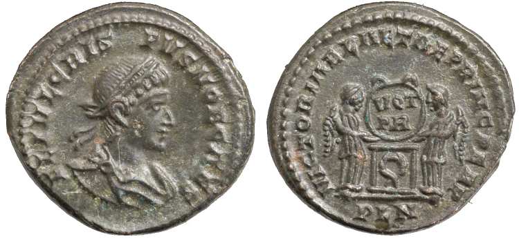 | Thessalonica RIC VII 105 | Crispus AE follis. 18mm. CRISPVS NOB CAES, laureate head right / CAESARVM NOSTRORVM around VOT V within wreath. Mintmark TSΔVI. | Text | Image |