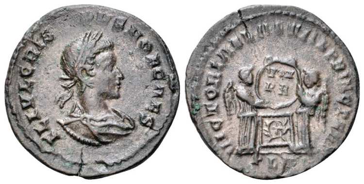 | London RIC VII 230 | Crispus AE follis. 18mm. CRISPVS NOBIL C, helmeted cuirassed bust left / BEATA TRANQVILLITAS, globe on altar inscribed VOT-IS-XX, three stars above. Mintmark PLON. | Text | Image |
