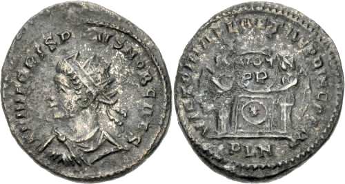 | Ticinum RIC VII 93 | Crispus AE follis.. 319 AD. FL IVL CRISPVS NOB C, radiate cuirassed bust right / VICTORIAE LAETAE PRINC PERP, two Victories holding shield inscribed VOT PR on an altar, C left. Mintmark PT. | Text | Image |