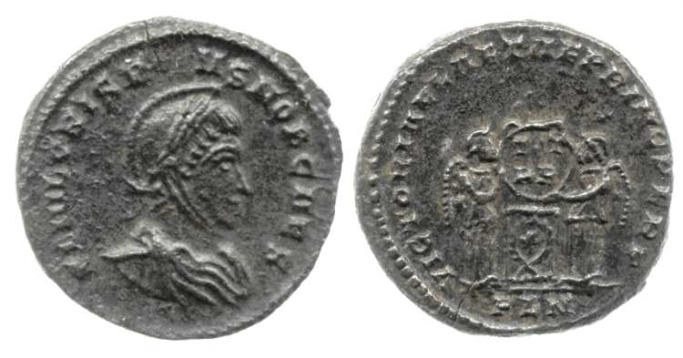 | Ticinum RIC VII 124 T dot | Crispus, AE follis. Ticinum, AD 319-320. C-RISPVS NOB CAES, laureate, cuirassed bust left, holding spear and shield / VIRTVS EXERCIT, standard inscribed VOT XX with two bound captives seated to left and right of its base. Mintmark T dot T. RIC VII Ticinum 124. RIC VII Ticinum 124; Sear 16851. | Text | Image |