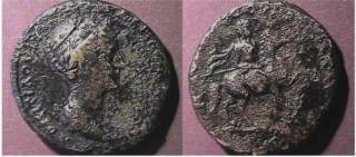 | Nicaea RecGen 122 Cohen 1 | Domitia Lucilla, mother of Marcus Aurelius, AE29 of Nicaea, Bithynia. ca 150 AD. ΔOMITIA ΛOYKIΛΛAN NEIKAIEIC, draped bust right / M AYΡHΛIOC OYHΡOC KAICAΡ, Marcus Aurelius on horseback right with long caduceus & trailing cloak. RecGen 122. | Text Text | Image Image |