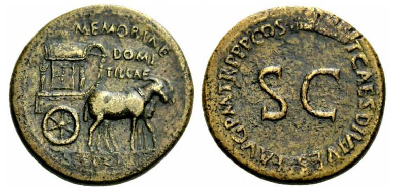 | RIC 262 Sear 2577 | Domitilla the Elder AE Sestertius. Struck 80-81 AD under Titus. IMP T CAES DIVI VESP F AVG P M TR P P P COS VIII around large SC / MEMORIAE DOMI-TILLAE, carpentum right drawn by two mules, SPQR in ex. Cohen 1. | Text | Image |