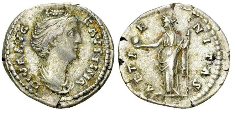 | RIC 348 Sear 4577 | Diva Faustina I Denarius. DIVA FAVSTINA, draped bust right / AETERNITAS, Fortuna standing left, holding globe and rudder. RIC 348; RSC 6. | Text | Image |