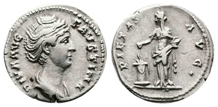 | RIC 373 Sear 4589 | Faustina I denarius. AVGVSTA, Pietas standing left with right hand over altar and holding box in left. RSC 124. | Text | Image |