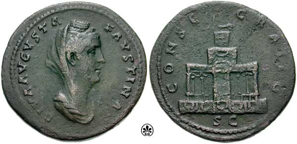 | RIC 1195 | Faustina I, AE As, posthumous issue struck after AD 141. DIVA AVGVSTA FAVSTINA, draped bust right. / PIETAS AVG, Hexastyle temple with statue in pediment, SC below. RIC III 1195; Cohen 255. | Text | Image |