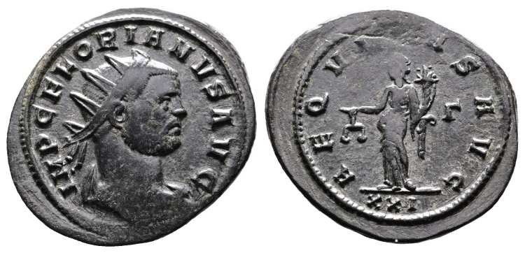 | RIC 47 | Florian AE Antoninianus. IMP C FLORIANVS AVG, radiate, draped and cuirassed bust right / VIRTVS AVG, Florian standing right, holding globe and spear. Mintmark XXIS (XXI digamma). RIC 47, Cohen 97. | Text | Image |