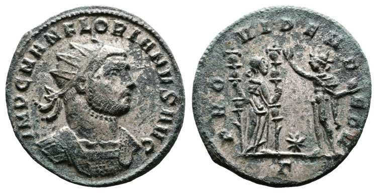 | RIC 116, P | Florian AE Antoninianus. Cyzicus, AD 276. IMP FLORIANVS AVG, radiate, draped and cuirassed bust right / CONCORDIA MILITVM, Victory standing right, presenting wreath of victory to Florian standing opposite, holding spear. Cohen 15; Sear 11853. | Text | Image |