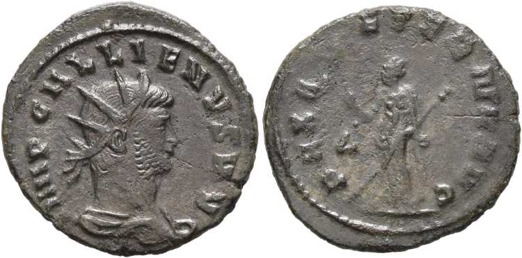 RIC 145 [j] | Gallienus, AE antoninianus. Rome, joint reign. 256-257 AD. IMP CP LIC GALLIENVS PF AVG, radiate, cuirassed bust right / LAETITIA AVGG, Laetitia standing left, holding wreath and anchor. RIC V-1 (J) Rome 145. | Text | Image |
