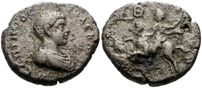 | RIC 72 | Geta, AR denarius, Rome, 210 AD. 19mm. IMP CAES P SEPT GETA PIVS AVG, laureate head right / PONTIF TR P II COS II, Geta, in military dress, on horseback galloping left, holding spear, captive on ground to left. RIC 72; Cohen 142; BMC 46. | Text | Image |