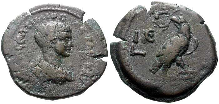 | Tomis Varbanov 5087 | Geta, AE26 of Tomis, Thrace. AVK Π CEΠ ΓETAC, laureate head right / MHTΡOΠ ΠON TOMEOC, eagle standing left, head right, on garlanded altar, wreath in its beak; military standard to left and right. Delta (value) at top right. Varbanov 5087 (this coin); Moushmov 2021. | Text | Image |