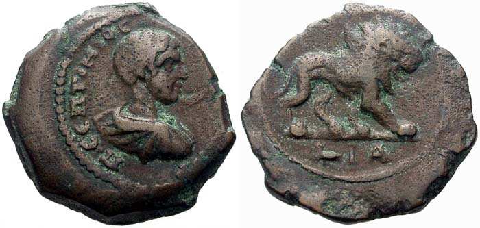 | Tarsos SNG Lev 1072 | Geta, AE36 of Tarsos, Cilicia. AD 198-209. Π CEΠTIMIOC ΓETAC KAICAΡ, bare-headed, draped and cuirassed bust right / AΔΡ CEYHΡIANH TAΡCOY MHTΡOΠ Γ-B, Dionysos, loins draped, standing right, holding thyrsos, right hand over head, panther at foot left. Star in left field. SNG Levante 1072 (this coin); SNG France 1546. | Text | Image |