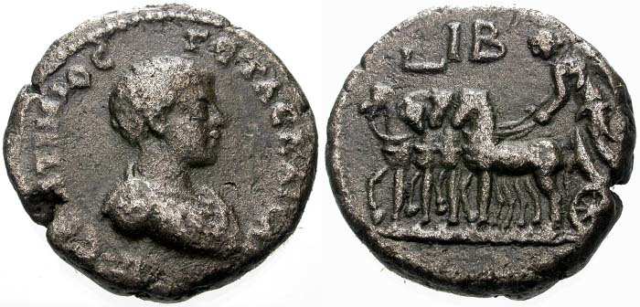 | RIC 43 var RSC 67a | Geta, AR denarius, Rome, AD 203-208. 20 mm, 2.83 g. P SEPTIMIVS GETA CAES, bare-headed, draped bust right. / LAETITIA TEMPORVM, Circus scene with galley, two quadrigae in upper fields, various animals around. RSC 67a; RIC 43 var (number of quadrigae); Vautier 1245 (same dies but misdescribed "four quadrigae"). | Text | Image |