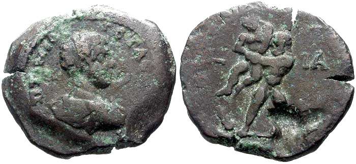| Topirus Varbanov 2696 | Geta, AE26 of Topirus, Thrace. AD 197-211. 7.93 g. AVT K Π CEΠTIMI ΓETAC, laureate head right, circular (engraved) pseudo-countermark ΓE TA (both letter groups ligate) / OYΛΠIAC TOΠIΡOY, Herakles sitting left on rock, holding club between his knees. Varbanov 2696; Moushmov 4989; SNG Evelpidis 1032. | Text | Image |
