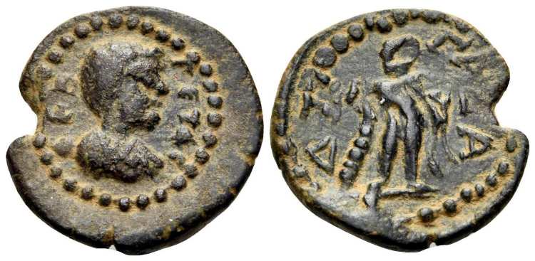 | Tralles Waddington 5446 | Geta, AE18 of Tralles, Lydia. AD 198-209. AY K ΠO CE ΓETAC, laureate, draped and cuirassed bust right / TΡAΛΛIANΩN, Artemis walking right, holding bow and reaching for arrow from quiver at her shoulder, hound at foot. Waddington 5446; Paris 1707; GRPC Lydia 292. | Text | Image |