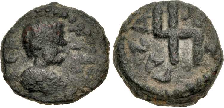 | Siocharax Leu 7, 2009 | Siocharax, AE21 weight, 4.39 g. Made from coins of Geta and Sept. Severus, probably in 4th-6th century. Serrated cuts over ΠO CEΠTI ΓETAC KAI, bare-headed, draped and cuirassed bust right. / Serrated cuts over MOXEANΩN CIOXAΡAKEI-TΩN around, EPI (retrograde above and to left), ΦIΛICKOY AIΔOYX below, Kybele seated left, holding patera, resting arm on drum, two lions at her side. Obv: Aulock Phrygien I 904-907, Rev: Aulock Phrygien 1, 899; Imhoof AGM 213. | Text | Image |