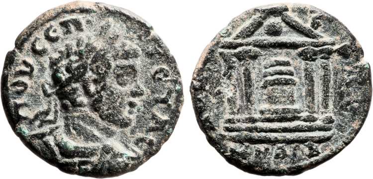 | Silandus GRPC Lydia 93 | Geta, as Caesar, AE 34mm of Silandus, Lydia. Helenus and Apollonius, magistrates. Λ CEΠTI ΓETAC KAICAΡ, bare-headed, draped, and cuirassed bust right / EΠI EΛENOY AΠOΛ AΠ A TO B, CIΛANΔE-ΩN in two lines in exergue, octastyle temple with globe in pediment. GRPC Lydia 93 otherwise unpublished. | Text | Image |