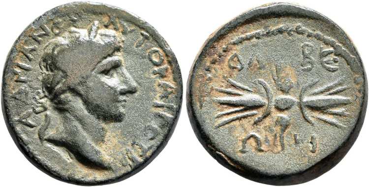 Samosata Butcher 15 | Hadrian, AE13 of Samosata, Commagene. Dated local year 19, AD 134-135. AΔΡIANOC CEBACTOC, laureate, draped and cuirassed bust right. / Φ-Λ C-A ET-IΘ in three lines to left and right of winged caduceus. Butcher 15; Paris 1460; RPC III 3424. | Text | Image | |