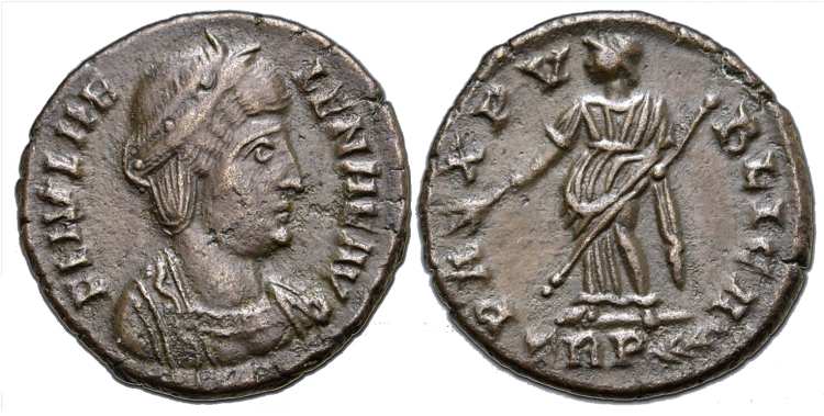 | Trier RIC 78 | Helena AE4. FL IVL HELENAE AVG, diademed and draped bust right / PAX PVBLICA, Pax standing left with branch and sceptre. Mintmark TRP or TRS in ex. | Text | Image |