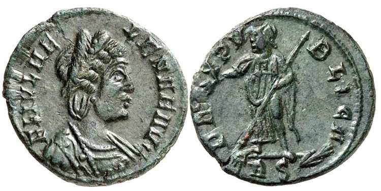 | Heraclea RIC 79, B | Helena AE Follis. FL HELENA AVGVSTA, diademed and mantled bust right / SECVRITAS REIPVBLICE, Securitas standing left, lowering branch with right hand, raising hem of robe with left hand. Mintmark SMHB. Sear 16613. | Text | Image |