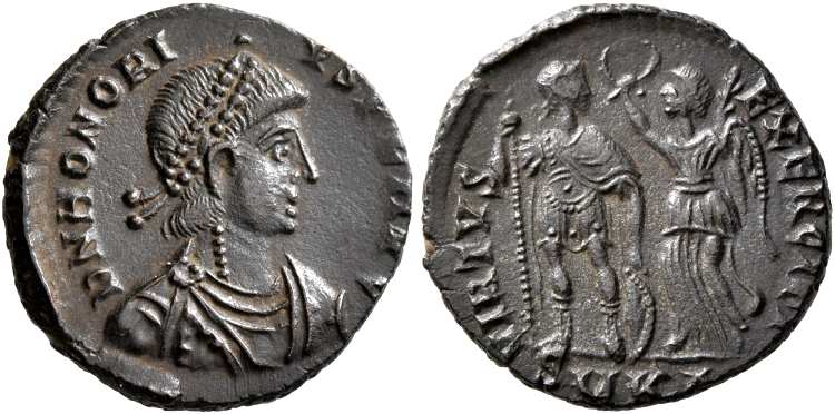 | Antioch RIC X 73 | Honorius AE3. Antioch mint. DN HONORI-VS PF AVG, rosette-diademed, draped, cuirassed bust right / VIRTVS-EXERCITI, Emperor standing left, head right, holding spear and resting left hand on shield. Victory, standing beside him crowns him with a wreath held in her right hand. Mintmark: ANTΔ. RIC X 73; Sear 21031 | Text | Image |