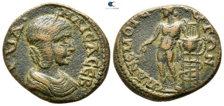 | Panemoteichos Aulock Pis. 1134 | Julia Maesa, AE24 of Panemoteichos, Pisidia. AD 218-224. 7.37 g. IOYΛIA MAICA CEB, draped bust right, wearing stephane. / ΠANEMOTEIXEITΩN, Apollo, naked, standing left, holding branch and resting left elbow on a lyre set on serpent-entwined tripod to right. Aulock Pisidien 1 1134; Rome DS111687; RPC VI temp 6073. | Text | Image |