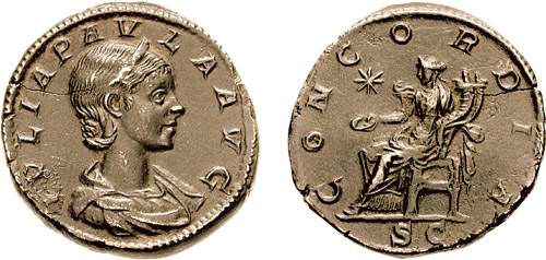 | RIC 381 Sear 7660 | Julia Paula AE Sestertius. 220 AD. IVLIA PAVLA AVG, diademed draped bust right / CONCORDIA, Concord seated left with patera and double cornuacopiae, star before, SC in ex. Cohen 8. | Text | Image |