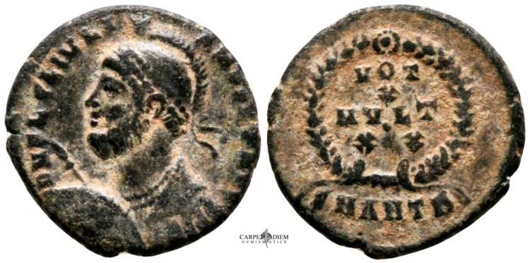 | Antioch RIC VIII 221 var | Julian II, AE follis, Antioch. 361-363 AD. DN FL CL IVLIANVS PF AVG, pearl-diademed, helmeted and cuirassed bust left, holding spear and shield. / VOT-X-MVLT-XX in four lines within wreath. Mintmark SMANTB. RIC VIII Antioch 221 var (officina and mintmark without palm branches). | Text | Image |
