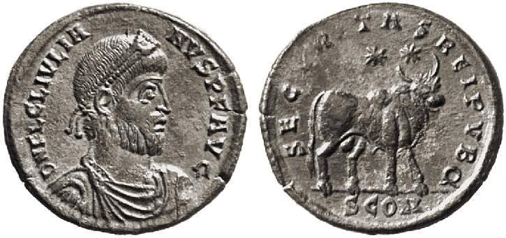 | Lyons RIC VIII 236, P | Julian II AE1. DN FL CL IVLIANVS PF AVG, pearl-diademed bust right, draped and cuirassed / SECVRITAS REIPVB, bull standing right, two stars above. Mintmark LVGDOFFP. RIC VIII Lyons 236; Sear 19145. | Text | Image |