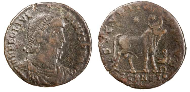 | Antioch RIC VIII 216, B | Julian II AE1, Antioch. DN FL CL IVLI-ANVS PF AVG, pearl-diademed, draped and cuirassed bust right / SECVRITAS REIPVB, bull standing right, two stars above. Mintmark palm branch-ANTB-palm branch. RIC VIII Antioch 216; LRBC 2640. | Text | Image |