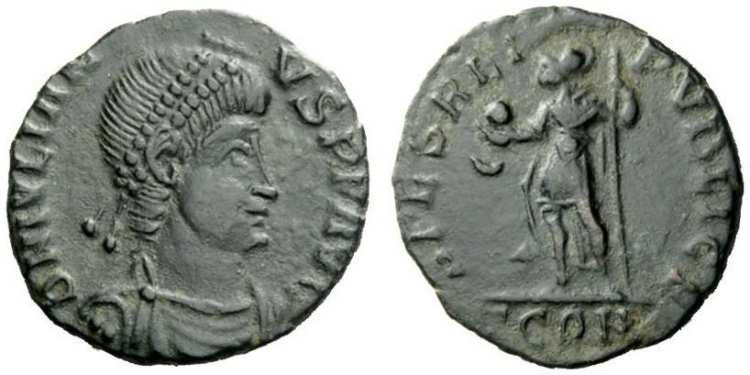 | Arles RIC VIII 276, T | Julian II, AE follis, Arles. AD 355-360. 19mm. 2.44 g. DN IVLIANV-S NOB CAES, bare-headed, draped, cuirassed bust right. / SPES REIPVBLICE, emperor, helmeted, in military dress, standing left, holding globe and spear. Mintmark TCON. RIC VIII Arles 276. | Text | Image |