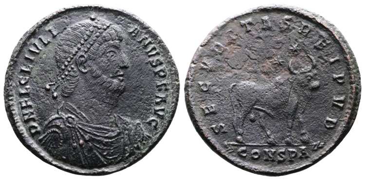 | Arles RIC VIII 318, S | Julian II AE1 27mm. 362-363 AD. DN FL CL IVLI-ANVS PF AVG, pearl-diademed, draped and cuirassed bust right / SECVRITAS REIPVB, bull standing right, two stars above; to right, eagle standing on wreath holding wreath in beak. Mintmark SCONST. LRBC 468. | Text | Image |