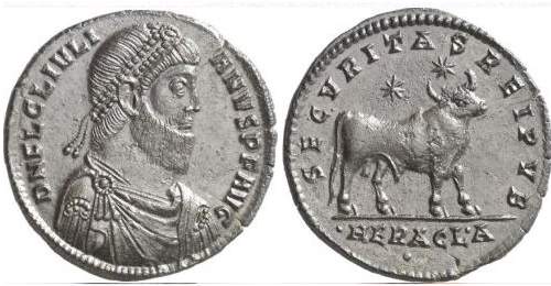 | Sirmium RIC VIII 106 | Julian II AE2. D.N. FL CL IVLIANVS PF AVG, pearl-diademed, draped and cuirassed bust right / SECVRITAS REIPVB, Bull standing right, two stars above. Mintmark star ASIRM wreath. | Text | Image |