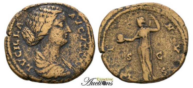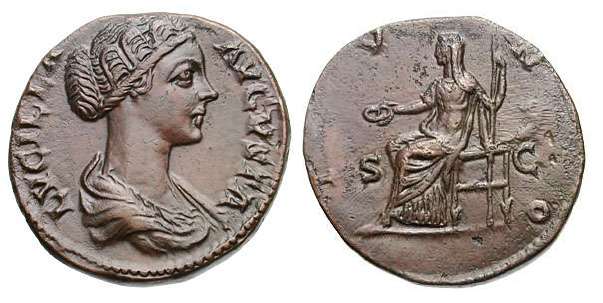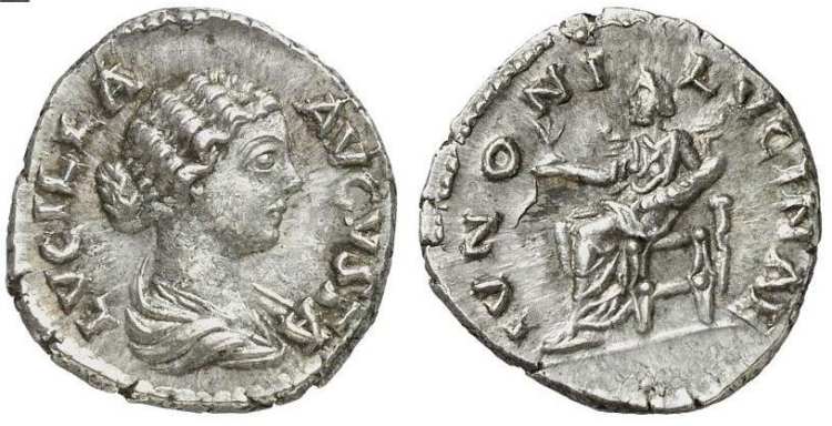 | RIC 1748 | Lucilla, AE sestertius, struck by Marcus Aurelius, 164-169 AD. LVCILLAE AVG ANTONINI AVG F, draped bust right / IVNONI LVCINAE, S-C, Juno, veiled, standing left, extending right hand and holding an infant wrapped in swaddling clothes. RIC 1748; Cohen 39; BMC 1153; Sear 5503. | Text | Image |