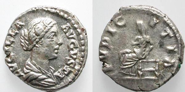 | RIC 781 Sear 5490 | Lucilla Denarius. LVCILLA AVGVSTA, draped bust right / PVDICITIA, Pudicitia seated left, veiled and holding hand on breast. RSC 62. | Text | Image |