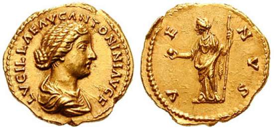 | RIC 783 Sear 5477 | Lucilla AV Aureus. LVCILLAE AVG ANTONINI AVG F, Draped bust right / VENVS, Venus standing left, holding apple in right hand and sceptre in left. Cohen 69. | Text | Image |
