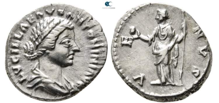 | RIC 785 | Lucilla Denarius. LVCILLA AVGVSTA, draped bust right / VENVS, Venus standing left, holding apple and sceptre. RSC 71. | Text | Image |