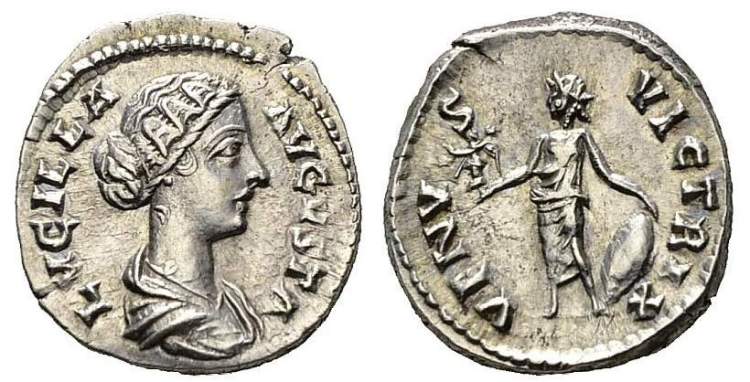 | RIC 786 Sear 5492 | Lucilla Denarius. LVCILLA AVGVSTA, draped bust right, hair in a bun / VENVS VICTRIX, Venus standing, head left, holding Victory and resting hand on shield. RSC 89. | Text | Image |