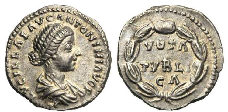 | RIC 792 | Lucilla, AR denarius. Rome. AD 164-182. 19 mm, 3.16 g. LVCILLAE AVG ANTONINI AVG F, draped bust right. / VOTA PVBLICA around wreath with dot in centre. RIC 792 (Aurelius); BMCRE 331 (Aurelius); RSC 99. | Text | Image |