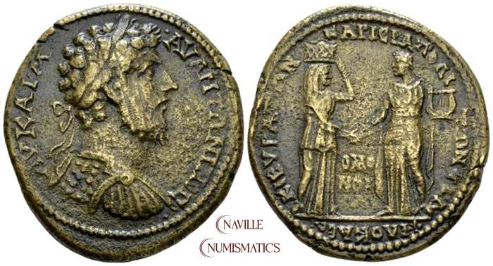 Syedra Nomos 6, 147 | Marcus Aurelius, AE28 of Syedra, Cilicia. AD 161-180. 3 Assaria, 18.19 g. AYT KAI M AYΡ ANTΩNINOC, Laureate, draped and cuirassed bust right / CYEΔΡEΩN, Dike, draped, on the left, leading Ares, helmeted and in military dress, who is tied with a rope held by Hermes, naked, standing left, holding caduceus. Unpublished reverse for Marcus Aurelius. Nomos 6, 147. | Text | ![]() |