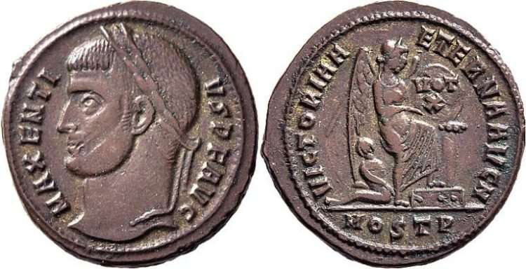 | Ostia RIC VI 62, P | Maxentius AE Half-Follis of Ostia. 2.99 g. AD 306-312. MAXENTIVS PF AVG, laureate head left. / VICTORIA AETERNA AVG N, Victory standing right, left foot on the base of a cippus, supporting shield on which she inscribes VOT XX FEL, bound captive sitting left behind her. Mintmark MOSTP. RIC 62; Cohen 122. | Text | Image |