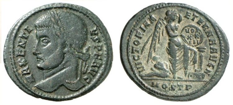| Ostia RIC 61 | Maxentius, AE half-follis of Ostia, AD 309-312. 22 mm, 2.89 g. MAXENTIVS PF AVG, Helmeted, draped and cuirassed bust left holding spear over shoulder, and shield on left arm. / VICTORIA AETERNA AVG N, Victory standing right, left foot on the base of a cippus, inscribing VOT X onto a shield affixed to the cippus. Captive sitting left at foot left. Mintmark MOSTT. RIC VI Ostia 61. | Text | Image |