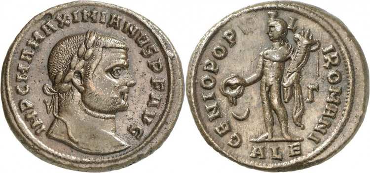 | Alexandria RIC VI 36b, Δ | Maximianus AE follis, Alexandria. IMP CMA MAXIMIANVS PF AVG, laureate head right. / GENIO POPVLI ROMANI, Genius standing left, modius on head, naked but for chlamys over left shoulder, holding patera and cornucopiae. Wreath over S in left field. Δ over P in right field. Mintmark ALE. RIC VI Alexandria 36b; Sear 13283. | Text | Image |